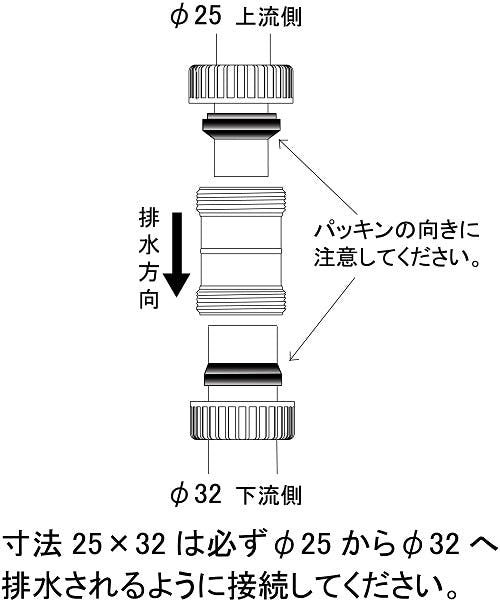 給水給湯配管や水受けトレイ、引き出しタイプなどが既設の排水位置と干渉する場合はご使用できません。寸法25×32は、必ずφ25からφ32へ排水されるように接続してください。