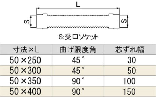 ホース部内面はフラットです。芯ずれに対応でき、施工性に優れています。耐震性に優れています。継手部が透明で塩ビ管との接続が確認できます。