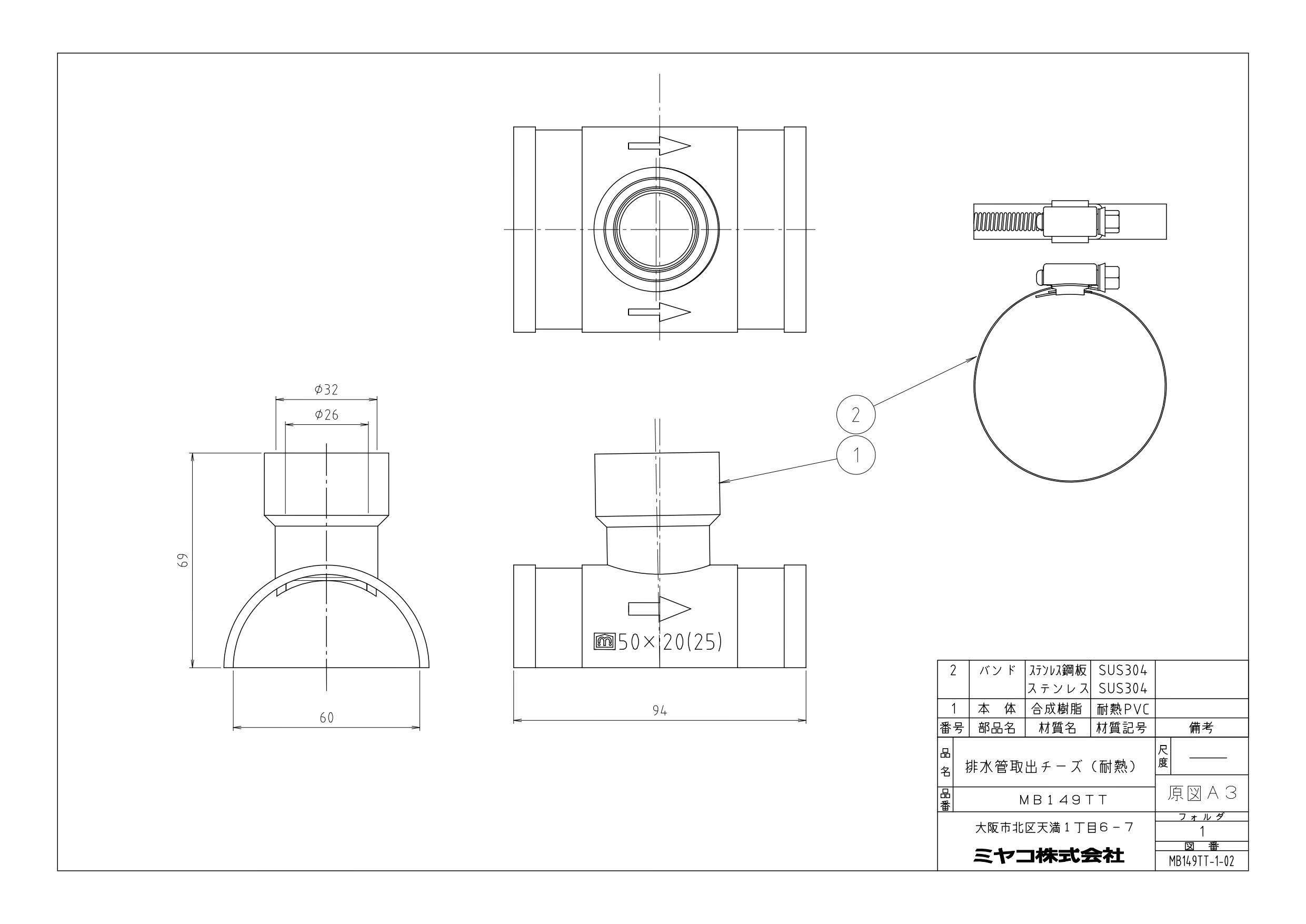 ミヤコ 排水管取出チーズ(耐熱) 寸法50×20mm MB149TT 50x20(25) 4909730823032