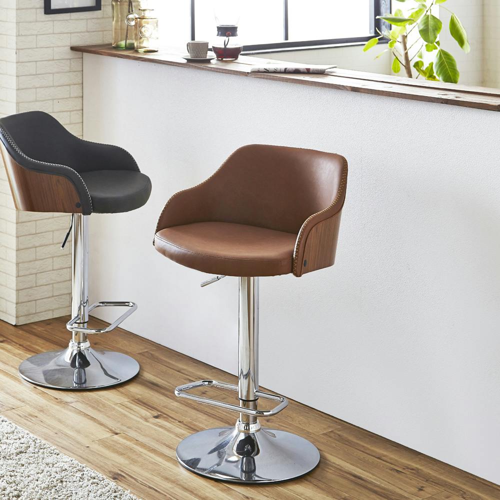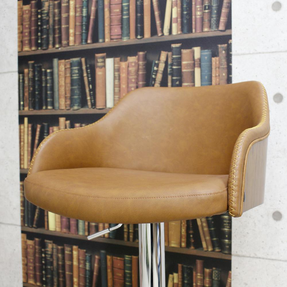 ●自宅でカフェ気分が味わえるカウンターチェアー。●木部はウォールナット突板を採用。●ミッドセンチュリー期を彷彿とさせる背と座お丸みが特徴的なデザインカウンターチェアー。●座面はガス圧式昇降で上げ下げも楽々。●座面高:63-83cm。●カラー:ライトブラウン色。●生産国:中国。