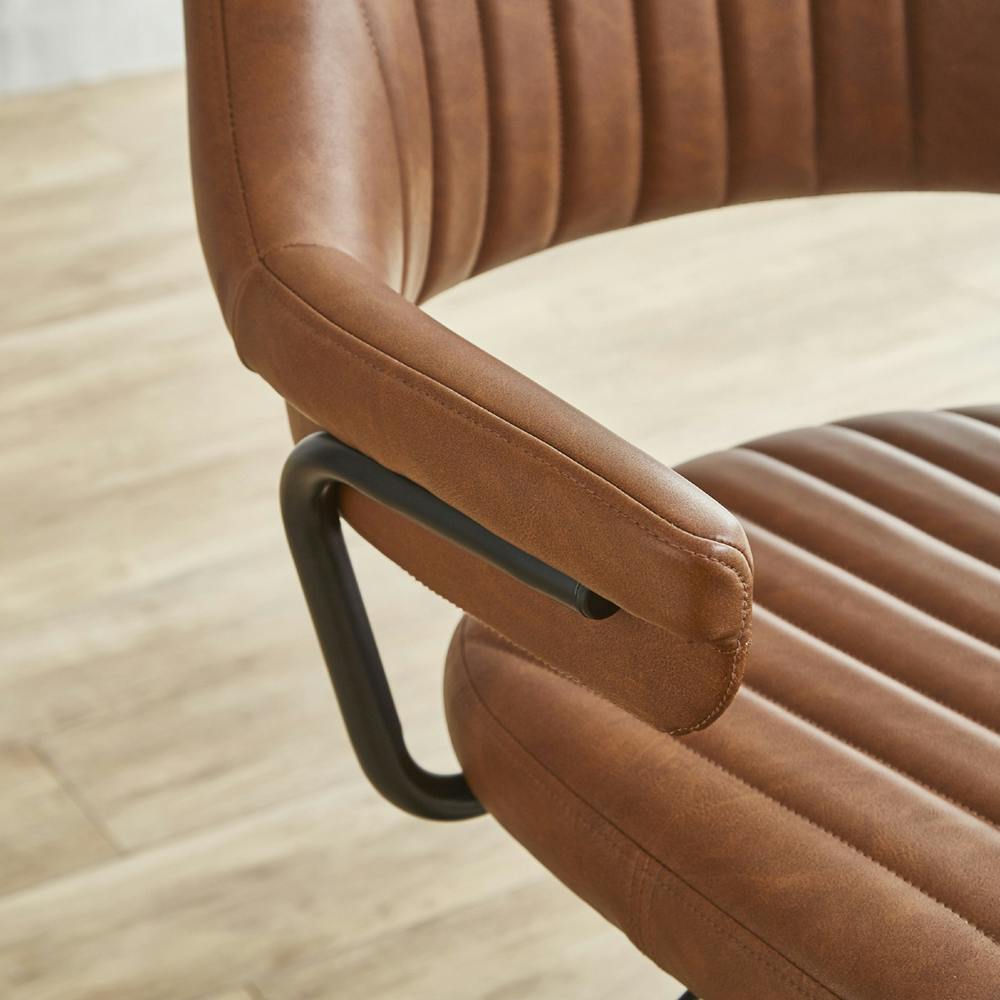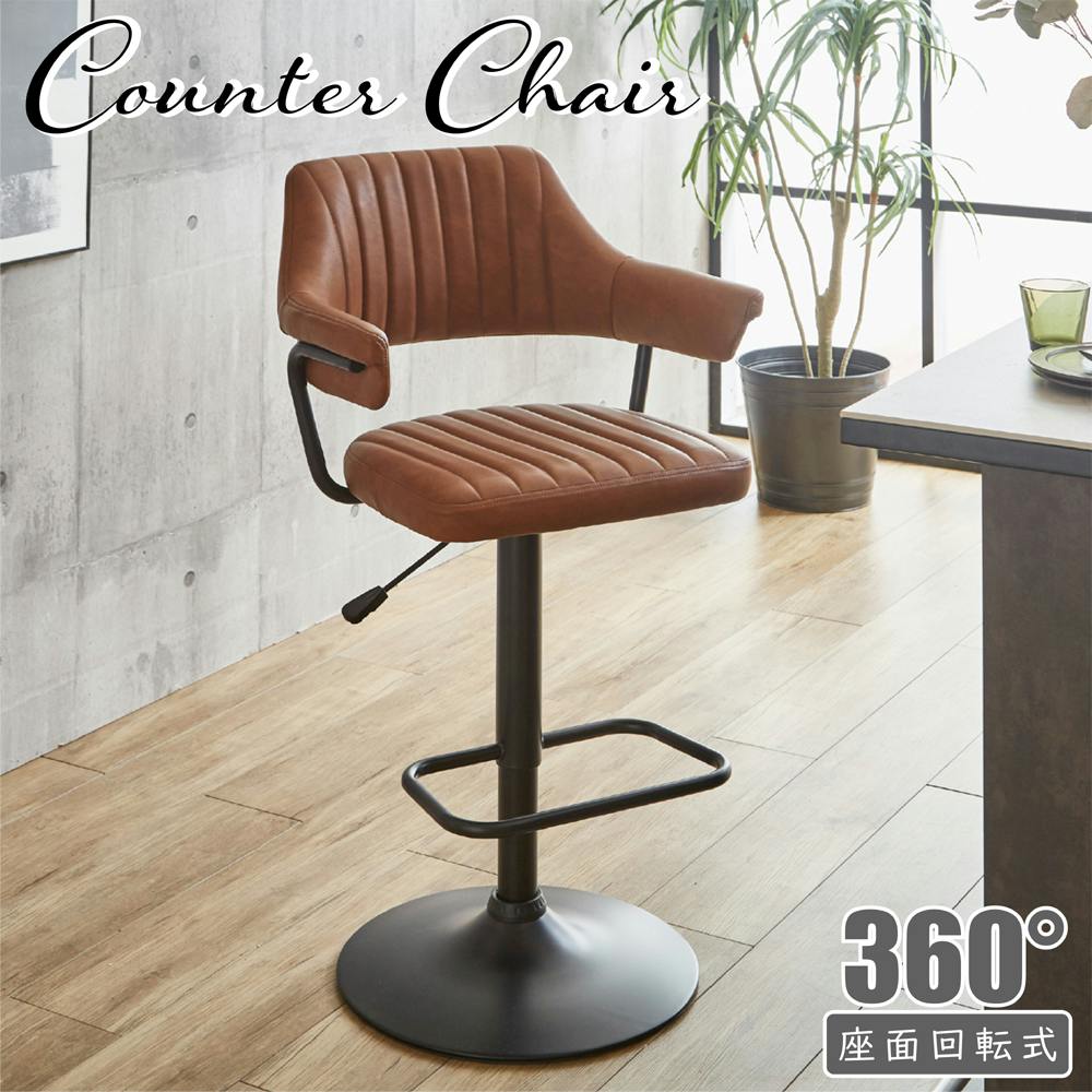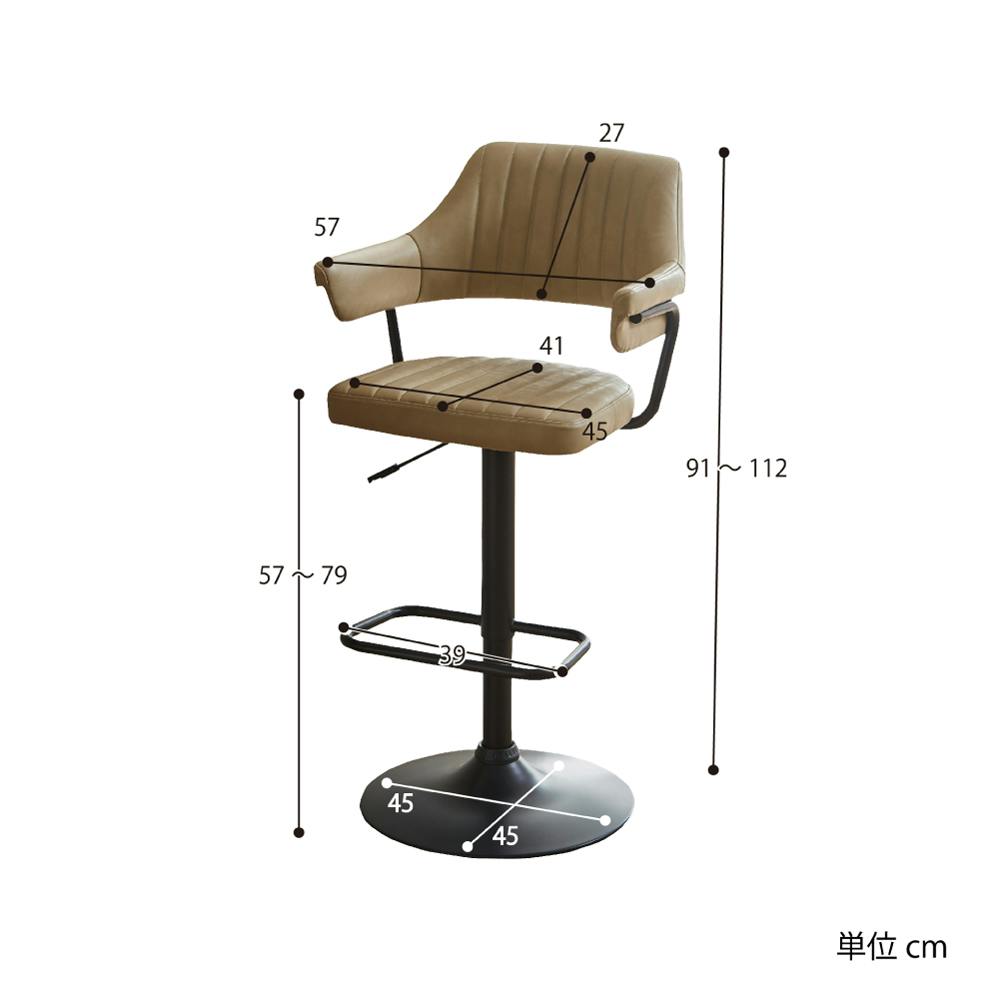 雰囲気あるヴィンテージ調デザイン。肘付なのでゆったりお寛ぎいただけます。座面は、昇降式で高さ57~79cmまで調整可能。座面も360度回転式で上り下りも自由自在。