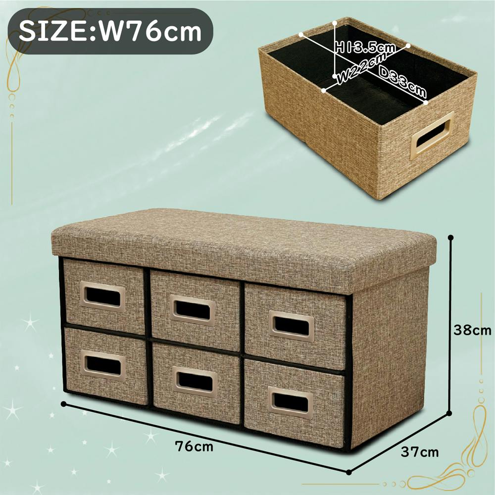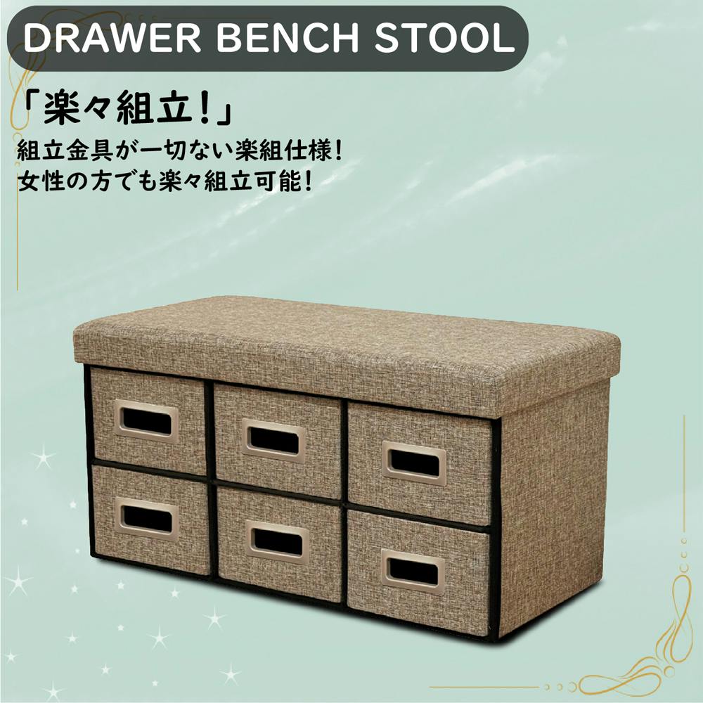 ●耐荷重80kgクリアした大容量の収納+踏み台+ベンチとしてもご利用可能な一石三鳥の便利なアイテム。●組立金具が一切ない楽組仕様で女性の方でも楽々組立可能。●幅76cmのベンチスツールは6杯引出しで大容量の収納可能。