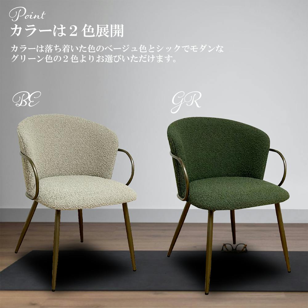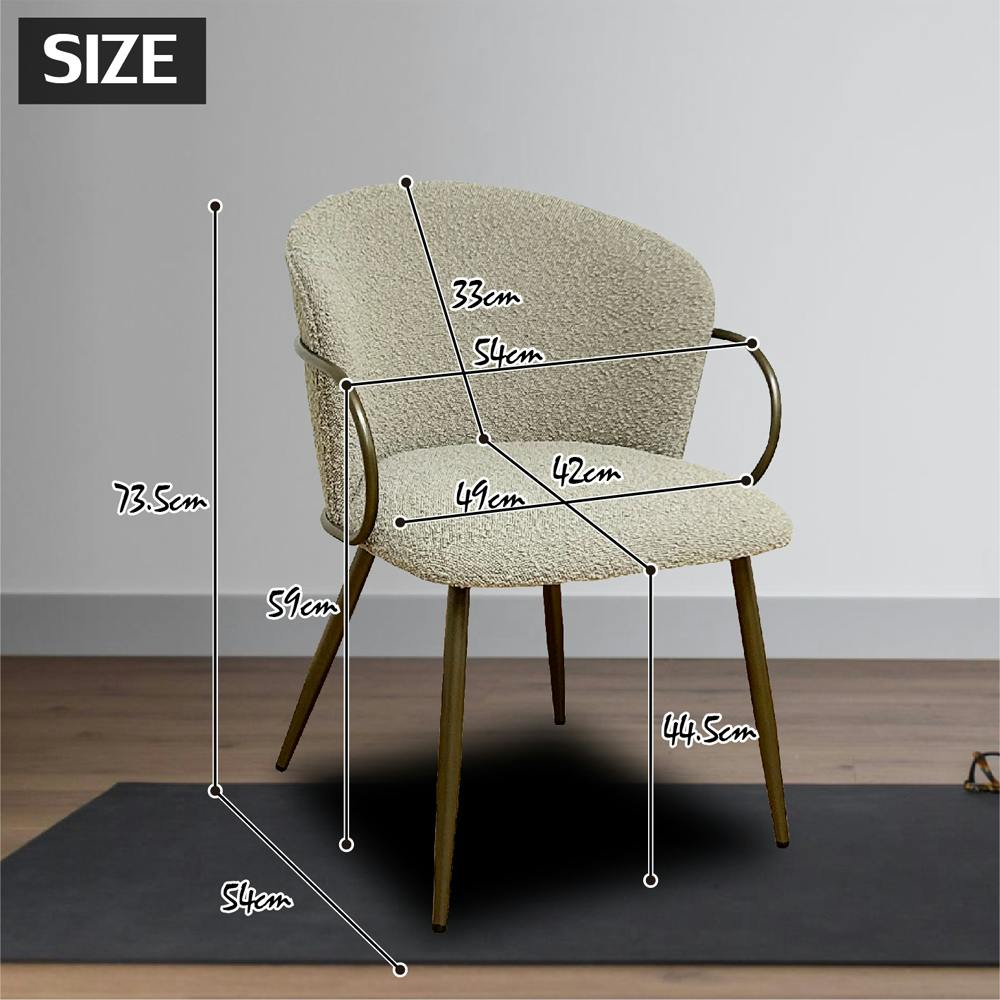 ●クラシックデザインで全体的に丸みのある曲線美の優しいダイニングチェアー。●生地は、凹凸のあるネップ生地。ダメージやヴィンテージを感じることのできる特殊な生地を採用。●脚部分、肘部分、背面部分のフレームもゴールドフレーム。ゴージャスかつクラシックダンな雰囲気。●ベージュ色。