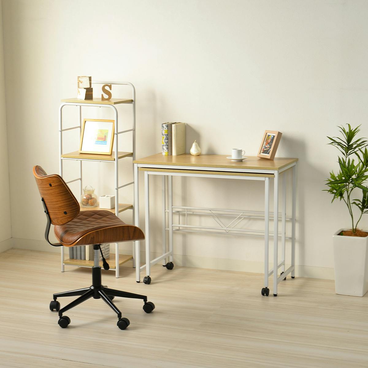 スチールと木柄の組み合わせで、お部屋に合わせやすいデスク。古木調のナチュラルな天板シートを使用しています。移動が簡単キャスター仕様。別売りのデスク ターブルW90にスッキリ収まる多用途で使える便利なデスク。