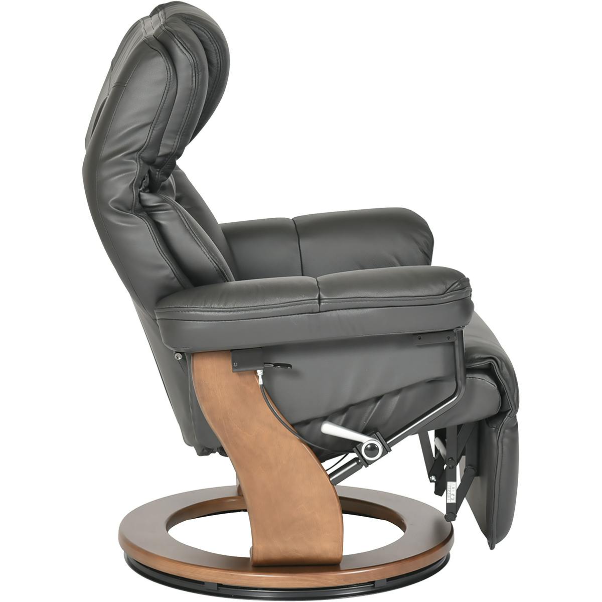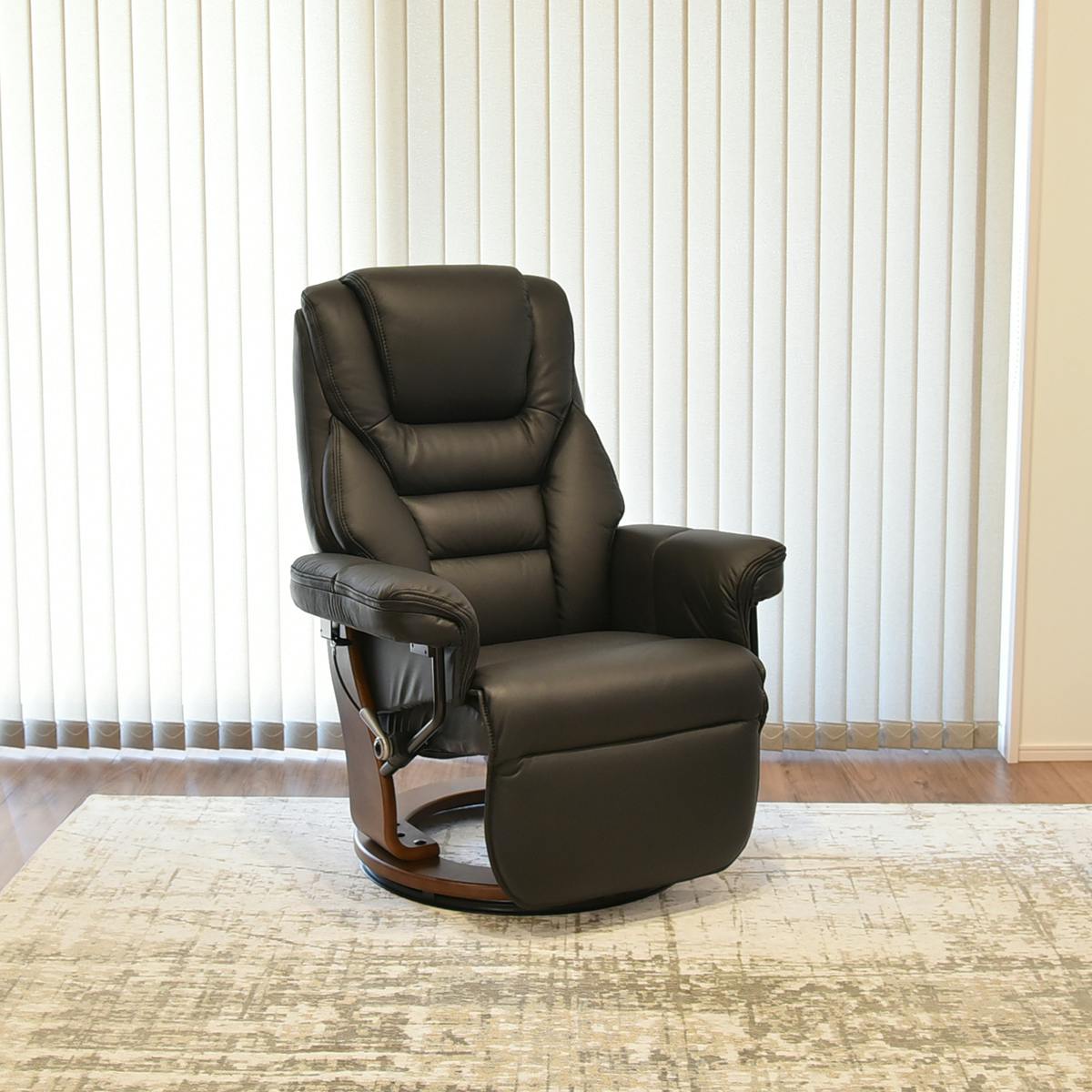 本革レザーを採用して柔らかな触り心地。レバー式無段階リクライニング調整が可能で、ワンタッチで自由な角度で固定できる機能付きです。フットレスト収納タイプヘッド部はフリーギアによるリクライニング可能360度回転式