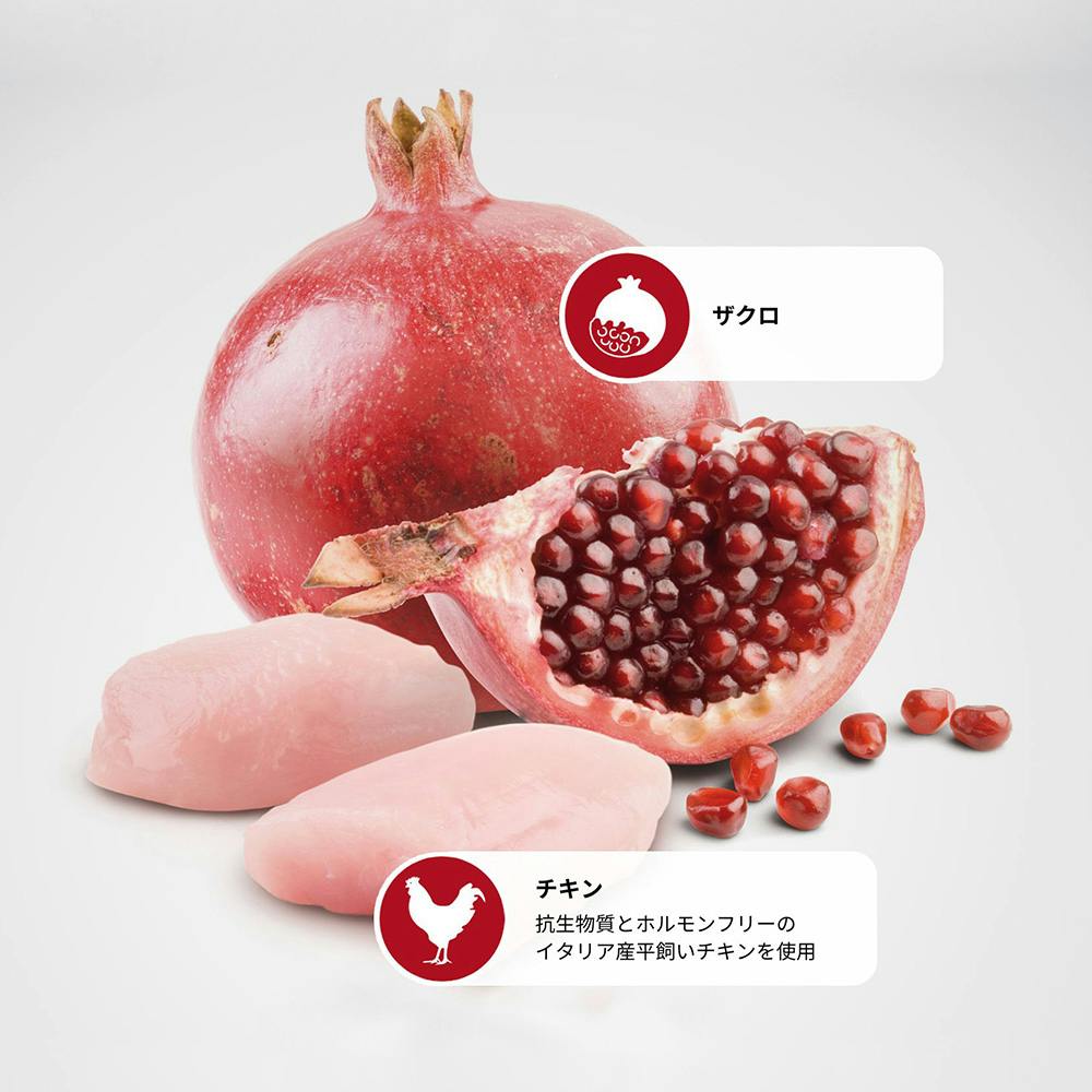 1.消化しやすい動物性タンパク質を98%使用(全タンパク質中)2.食物アレルギーや消化性に配慮したグルテンフリー設計。イタリア産放し飼いチキンを使用しザクロを配合。動物由来のタンパク質を豊富に使用した成犬用グレインフリーフードです