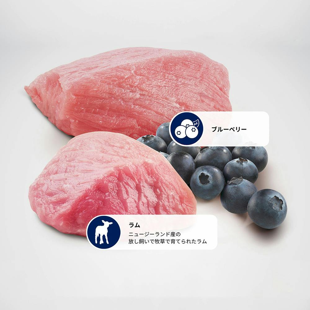 1.消化しやすい動物性タンパク質を98%使用(全タンパク質中)2.食物アレルギーや消化性に配慮したグルテンフリー設計。グラスフェッドラム肉を使用しブルーベリーを配合。動物由来のタンパク質を豊富に使用したグレインフリーフードです