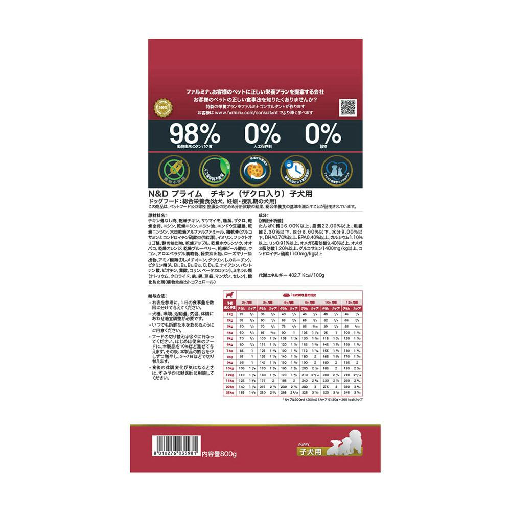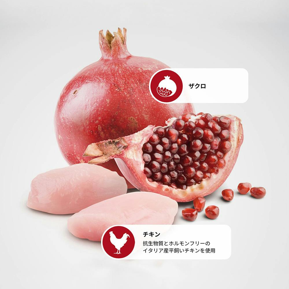 1.消化しやすい動物性タンパク質を98%使用(全タンパク質中)2.食物アレルギーや消化性に配慮したグルテンフリー設計。イタリア産放し飼いチキンを使用しザクロを配合。動物由来のタンパク質を豊富に使用した栄養価が高くバランスのとれた子犬用グレインフリーフード