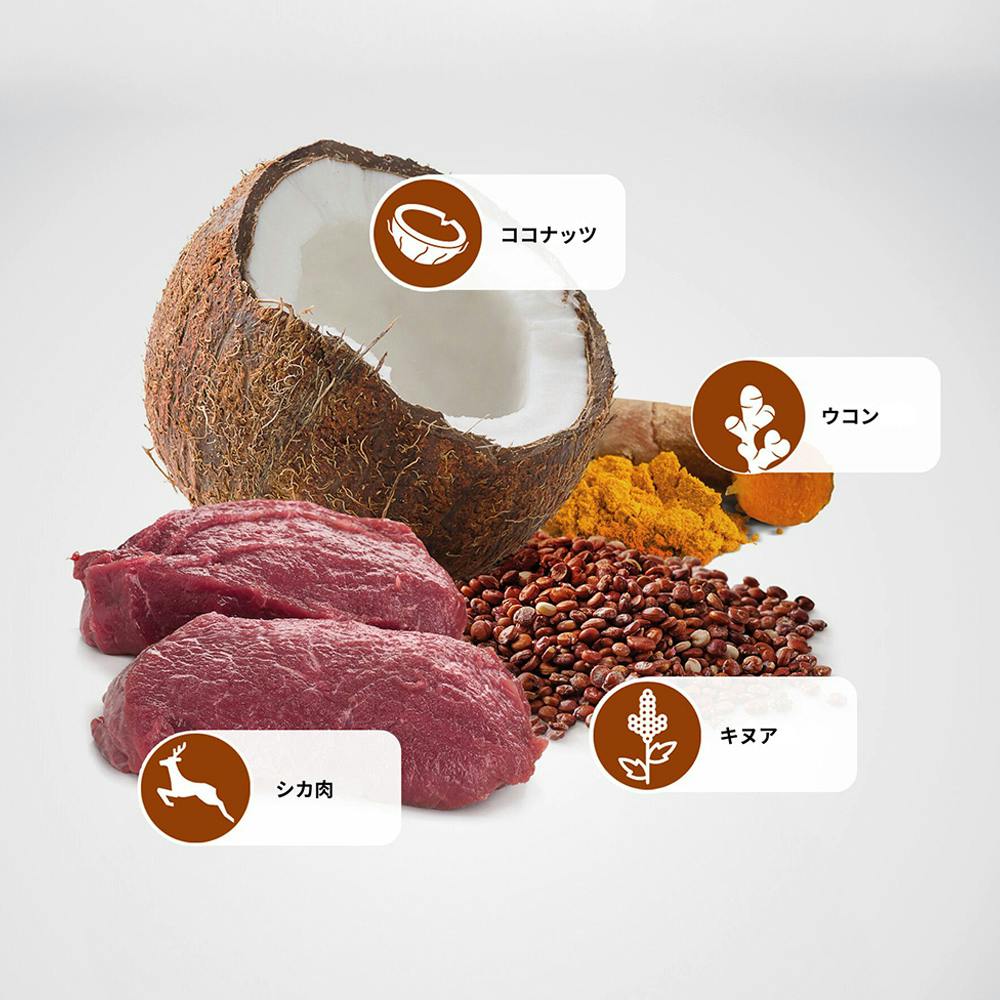 シカ肉、乾燥シカ肉、エンドウ豆デンプン、ニシン油、キヌア、亜麻仁、乾燥ココナッツ、ウコン、イヌリン、フラクトオリゴ糖、酵母抽出物、オオバコ、乾燥ビール酵母、グルコサミン塩酸塩、コンドロイチン硫酸、アロエベラゲル濃縮物、緑茶抽出物、ローズマリー抽出物 他