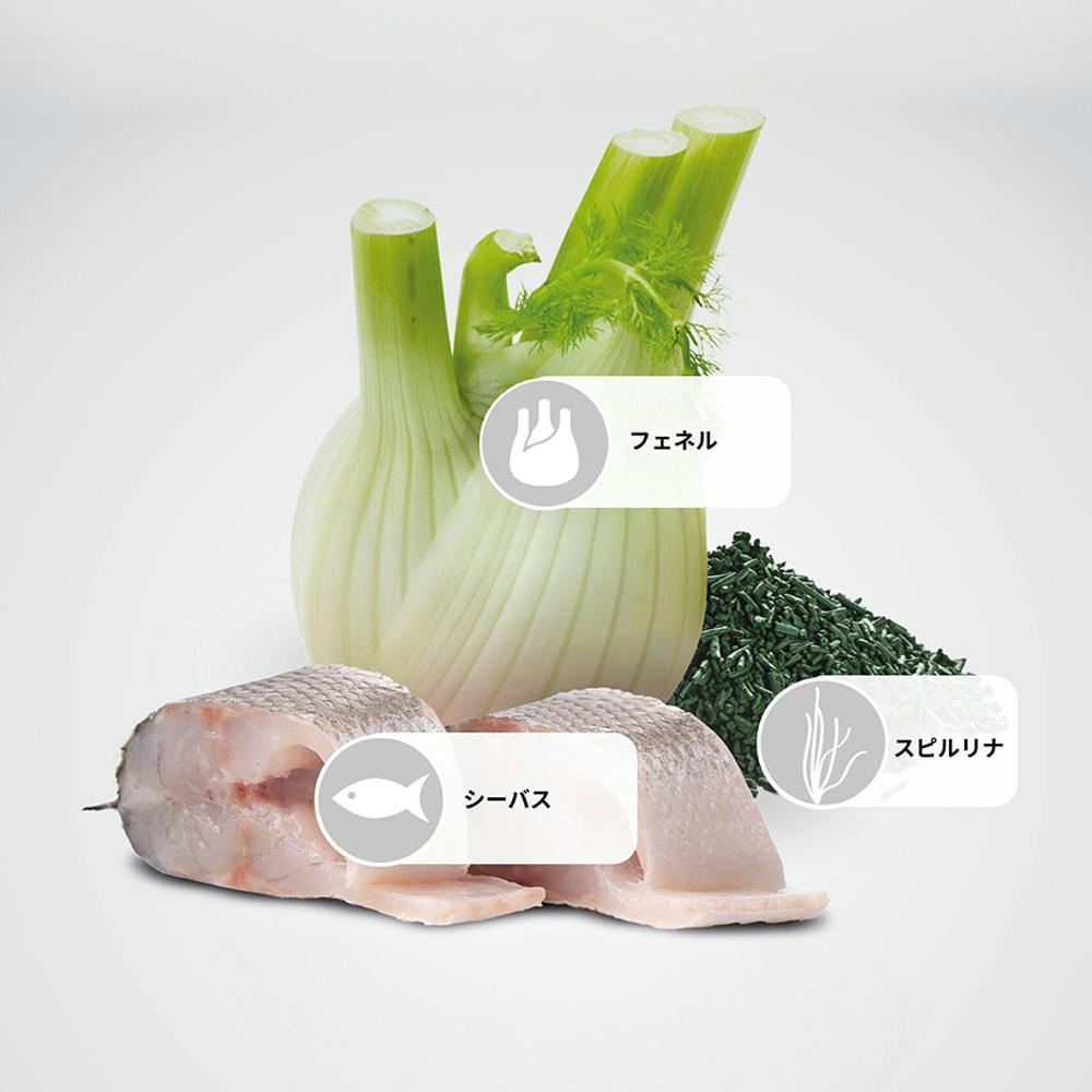 1.食物アレルギーに配慮し、タンパク源をお魚のみに限定2.スーパーフード「スピルリナ」を配合。単一性動物性タンパク質源としてシーバスを使用することでアレルギーによる炎症リスクを減らします