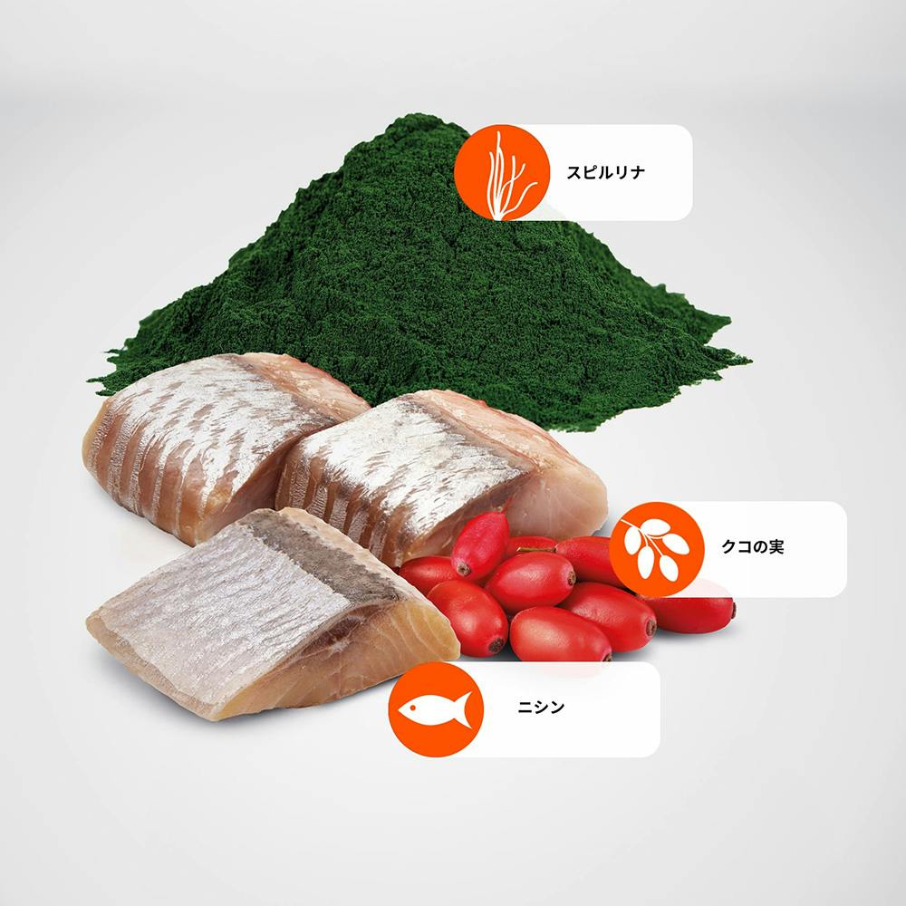 ニシン、乾燥ニシン、サツマイモ、ニシン油、粉末スピルリナ、クコの実、乾燥全卵、エンドウ豆繊維、乾燥ニンジン、天日乾燥アルファルファミール、イヌリン、フラクトオリゴ糖、酵母抽出物、乾燥ホウレンソウ、オオバコ、乾燥ビール酵母、ウコン、アロエベラゲル濃縮物、緑茶
