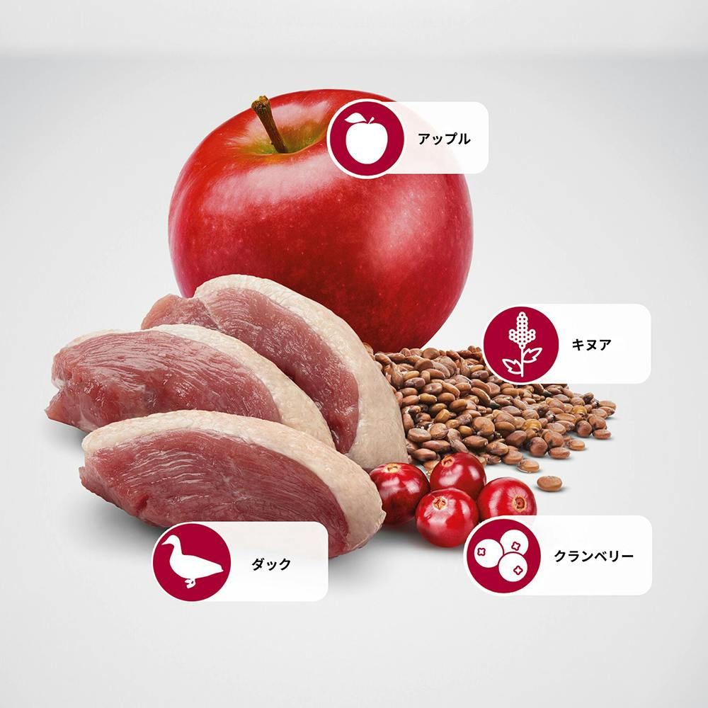 ダック、乾燥ダック、エンドウ豆デンプン、エンドウ豆繊維、キヌア、鶏脂、魚肉加水分解物、アップル、クランベリー、乾燥全卵、亜麻仁、乾燥ビートパルプ、ニシン油、オオバコ、乾燥ホウレンソウ、天日乾燥アルファルファミール、フラクトオリゴ糖、酵母抽出物、粉末セルロー