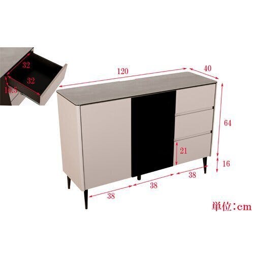 すっきりした脚部空間は16センチ高さのスチール脚仕様。引き出しはスムーズに奥まで引き出せるフルスライドレール。背面もキレイにみせる化粧仕上げ。角を丸みあるデザインに加工した安心デザインです。扉内内寸:W749XD285XH595mm。引き出し内寸:W320XD320XH120mm。すべての引き出し共通。可動棚3センチピッチ、12段階。可動棚2枚付。