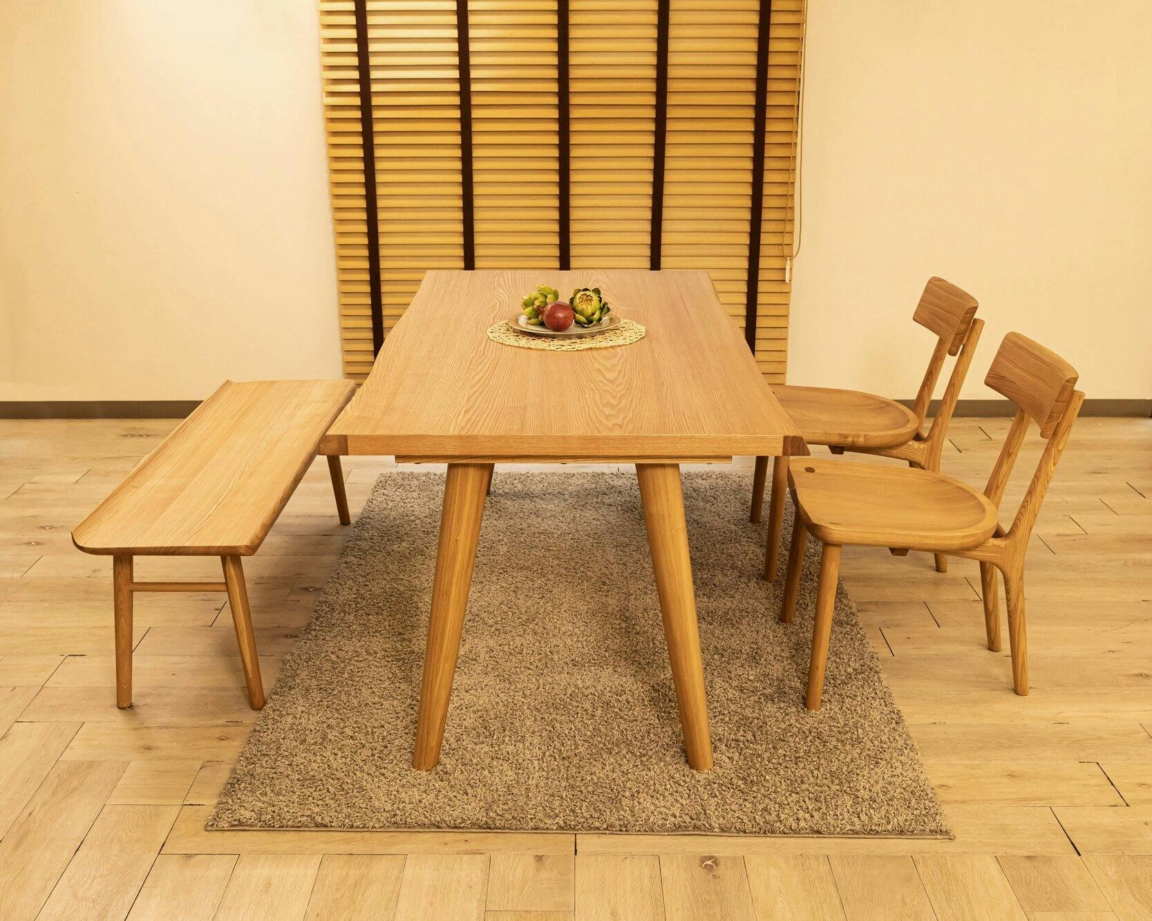 サイズは123・150の2種類。厚さ30mmの座面に長手方向側面にRを入れてしなやかさを加えています。2枚の無垢板を接ぎ、分厚い板を削り出してきれいなRを実現。クラフトテイストでありながら細部までこだわりのある逸品です。