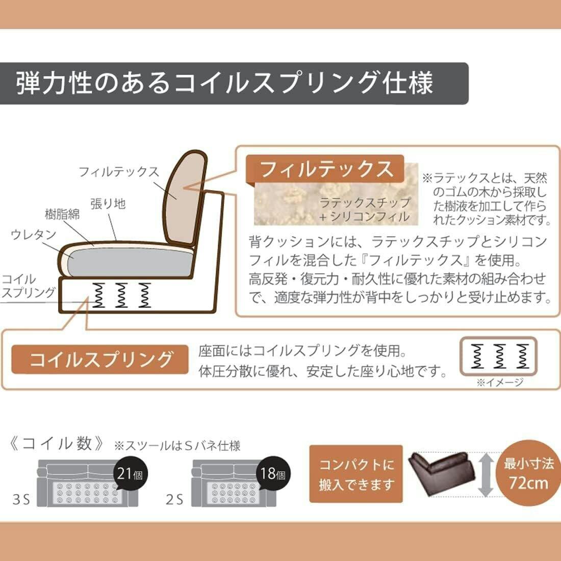 座面の高さを42cm、38cmからお選びいただけます。ハイタイプは12cm脚使用、お掃除ロボット対応、ロータイプは8cm脚使用で深く腰掛けても足がしっかり床に着く安定した座り心地です。座面には弾力性のあるコイルスプリング使用、体圧分散に優れ安定した座り心地です。