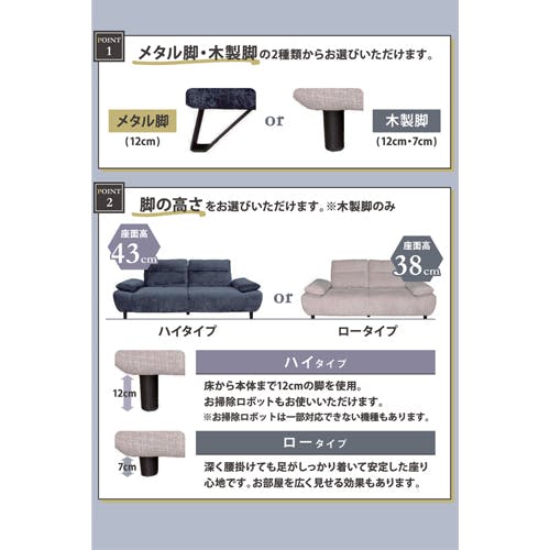 ●背もたれが可動式となっているため、通常時と使い分けができ、肘掛も角度調整が可能となっているため、ベットの代わりとしても使用が可能です。●また、カラーはNV、WHの2色から脚はメタル脚の12cm、木製脚の3タイプから選択ができます。