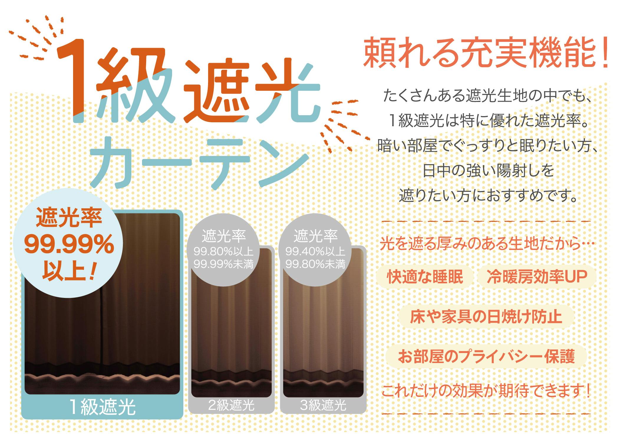 機能:遮光1級、UVカット70%、断熱20%、保温20%、ミラー、アジャスターフック付、ウォッシャブル●遮光:光を遮り室内を暗く保ちます●UVカット:家具や肌の紫外線対策に●断熱:外の暑さを遮ります●保温:室内の暖かさを保ちます●ミラー:昼間に外から見えにくい●ウォッシャブル:洗濯機で洗えます◯セットカーテン:ドレープとレースが同時に揃って便利◯無地カーテン:大窓やリビングにおすすめ