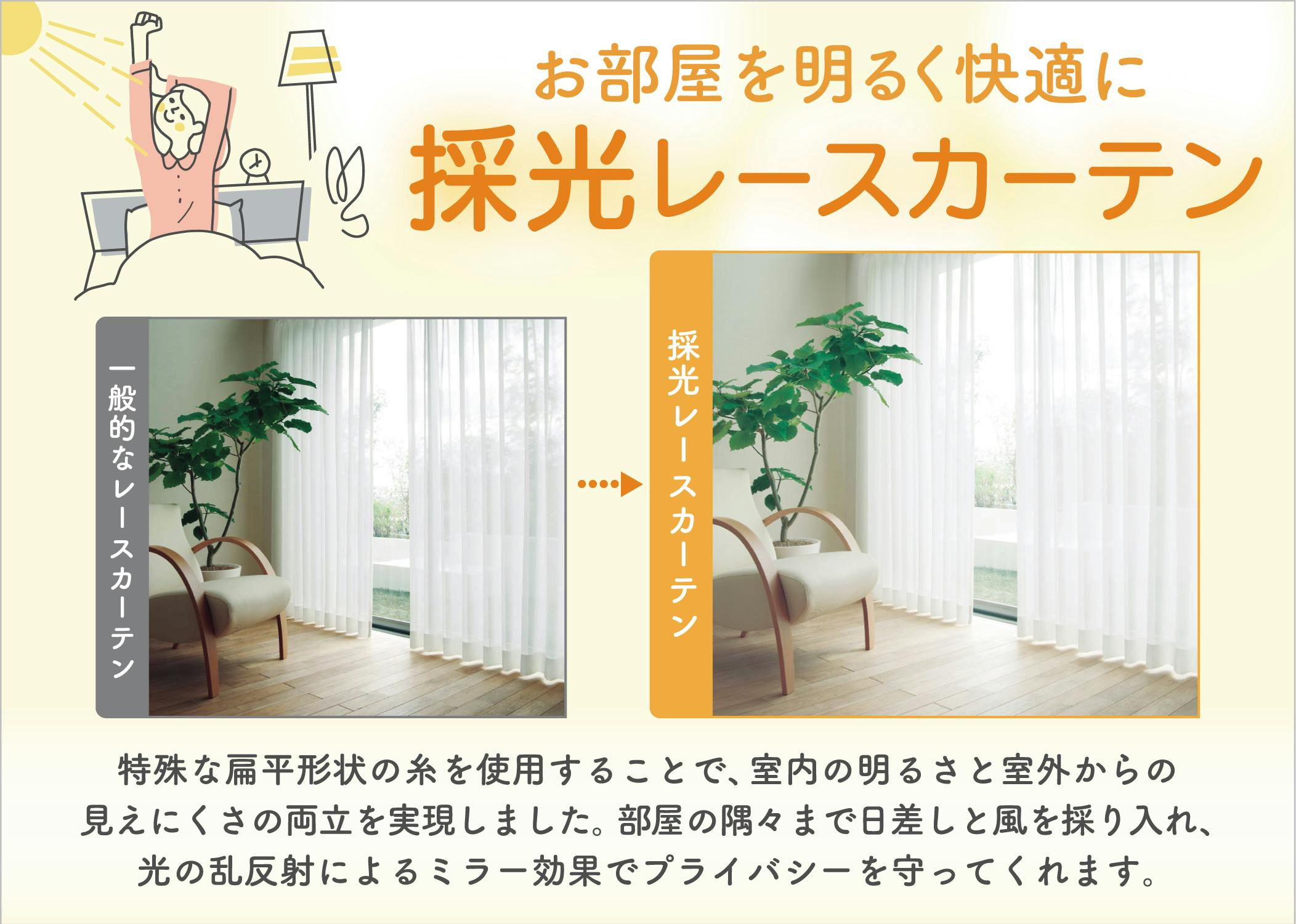機能:採光、UVカット80%、断熱20%、保温25%、ミラー、ウォッシャブル、●採光:室内が暗くなりにくい、●UVカット:家具や肌を紫外線から守ります、●断熱:外の暑さを遮ります、●保温:室内の暖かさを保ちます、●ミラー:昼間に外から見えにくい、●ウォッシャブル:洗濯機で洗えます、◯アジャスラーフック付き:丈の長さを調節できます、◯無地レース:どんなカーテンとも相性が良いです