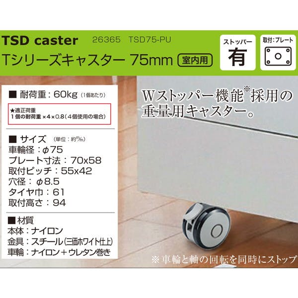 屋内用重量タイプ双輪キャスターサイズ:車輪径:75パイ プレート寸法:70x58 取付ピッチ:55x42 穴径:8.5パイ タイヤ巾:61 取付高さ:94 材質:本体:ナイロン 金具:スチール(三価ホワイト仕上) 車輪:ナイロン+ウレタン巻き 耐荷重:60㎏(1個当り) 適正荷重:1個の耐荷重x4x0.8(4個使用した場合)