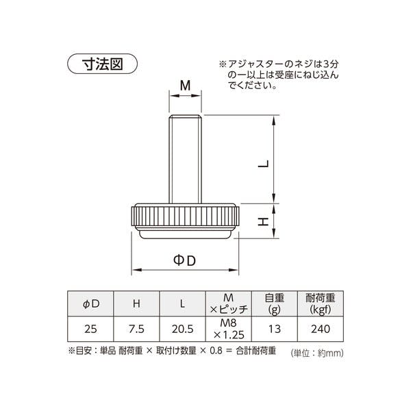 ●カラー:黒●サイズ:25φ●材質:ボルト/鋼(3価クロメート)、本体・底部/耐衝撃性ナイロン●M8●13g●対応床材:カーペット、フローリング、Pタイル●コード番号:00057340