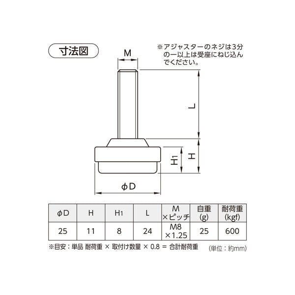 ●カラー:クローム艶消●サイズ:25φ●材質:ボルト/鋼(3価クロメート)、本体/ZDC(亜鉛ダイカスト)、底部/ABS●M8●25g●対応床材:カーペット、フローリング、Pタイル●コード番号:00057373
