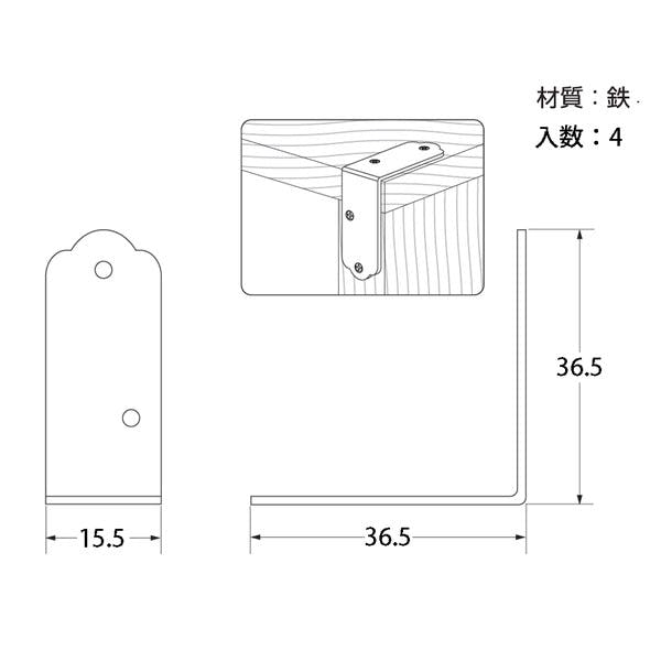●サイズ:幅15.5×長さ36.5×36.5mm●板厚:1mm●使用ビス:2.1×10●入数:4個/袋●コード番号:00072054