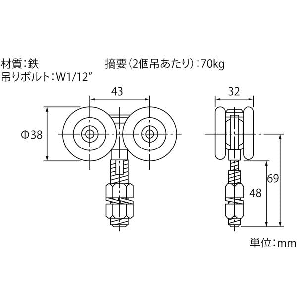●適用(2個吊当り):70kgまで●吊りボルト:W1/2●軸受部:含油焼結合金●コード番号:00091821
