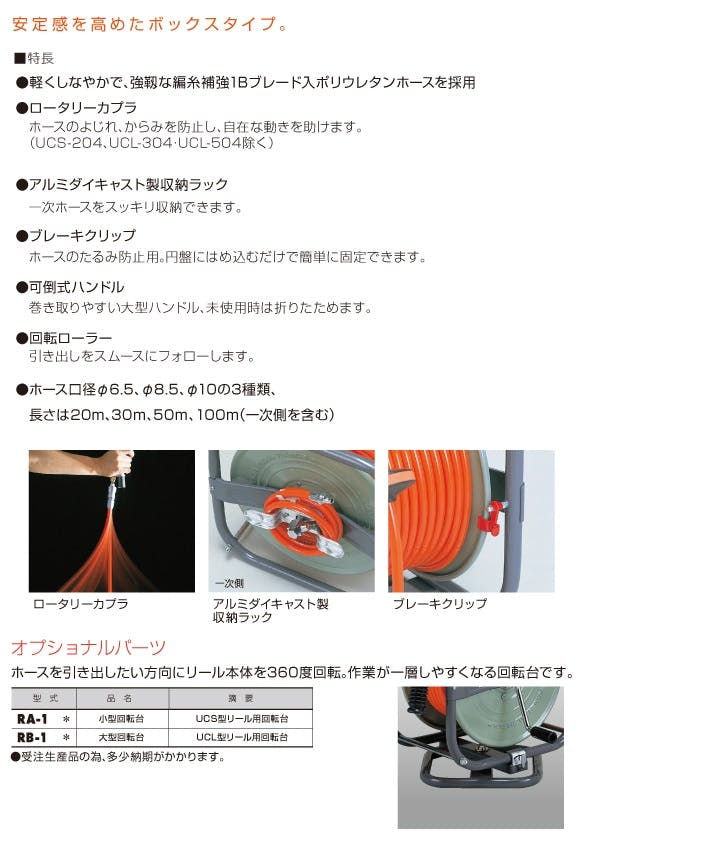 ●メーカー/ハタヤリミテッド(HATAYA)●型番/UCS-302●内径×外径/6.5×10mm●全長/28m●重量(kg)/7.0●使用圧力/1.5MPa●1次ホース/2m●サイズ/348(W)×227(D)×398(H)mm●材質/編糸補強 1Bブレード入ポリウレタン,円盤(鉄板)●ロータリーナットカプラー付●1次側にプラグ,2次側にソケット付