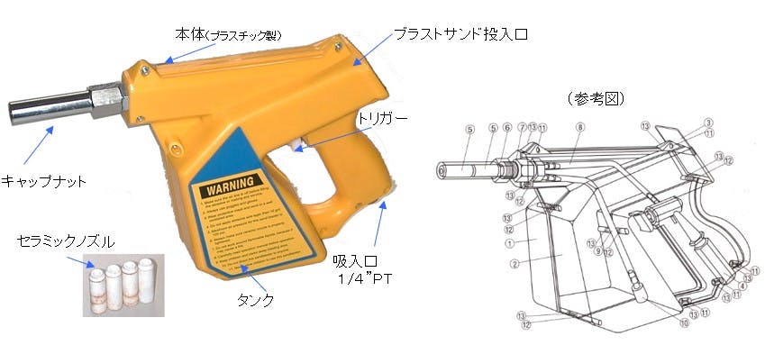 ●ノズル径/5mm●サイズ/175(H)×210(L)mm●重量/600g●使用圧力/0.31-0.62MPa(45-90PSI)●エアー消費量/140L/min●使用コンプレッサー/0.75kw以上●吸入口/Rc(PT)1/4”●サンドタンク能力/1kg●適応サンド/#16~#180●全長/300mm●1馬力以上のコンプレッサーをご使用ください