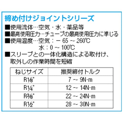 ●メーカー/アオイ●型番/ESIL-1065-3●材質/SUS316L●使用流体/空気,水,薬品●チューブ径(mm)外径/10●チューブ径(mm)内径/6.5●取付ねじ/R(PT)3/8”●使用温度/空気:-65~260℃,水:0~100℃●使用圧力はチューブ使用圧力に準拠する