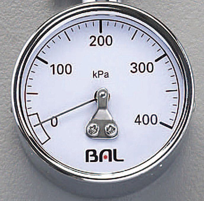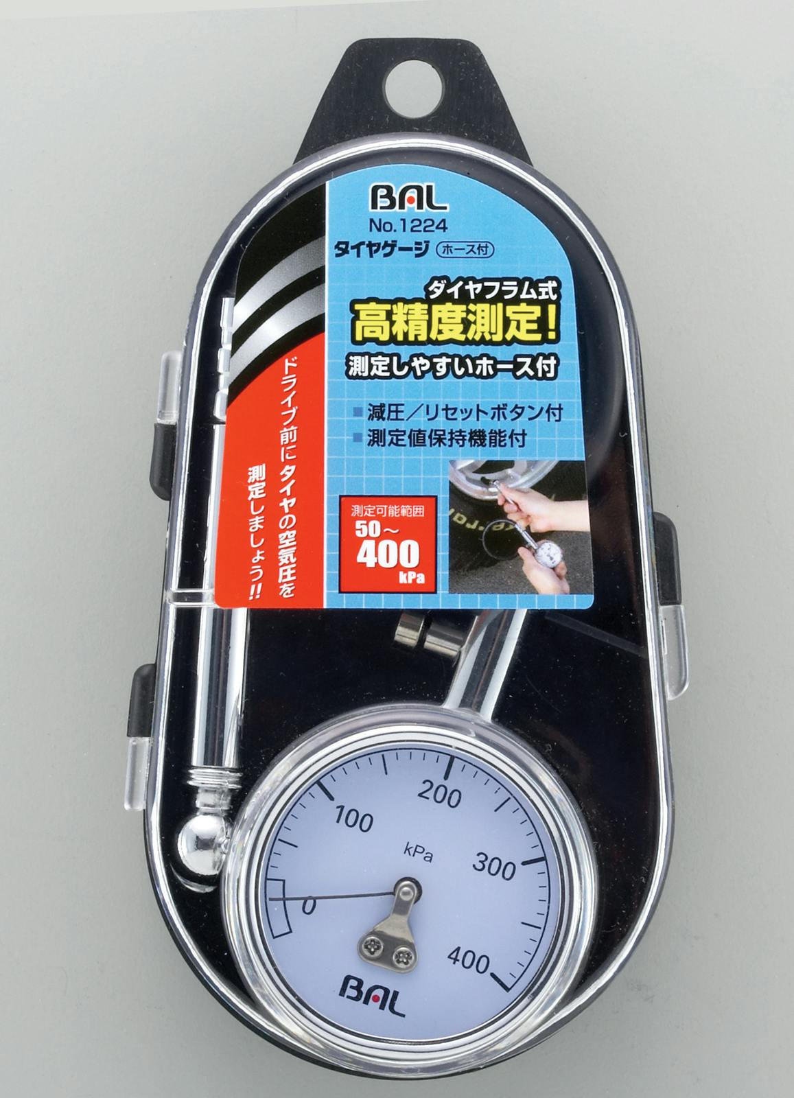 ●メーカー/大橋産業(BAL)●型番/No.1224●測定範囲/50~400kPa●最小目盛/10kPa●ホース長/270mm●アーム長/90mm●機能/測定値保持機能●ワンタッチ減圧ボタン●ダイヤフラム式●重量/220g●材質/本体:スチール●用途/乗用車・バイク