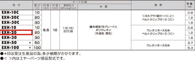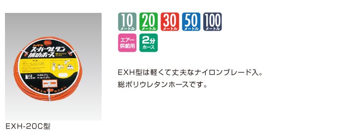 ●メーカー/ハタヤリミテッド(HATAYA)●型番/EXH-20●使用圧力/1.5MPa●ホース材質/ブレード入りポリウレタン●内径×外径/6.5×10mm●全長/20m