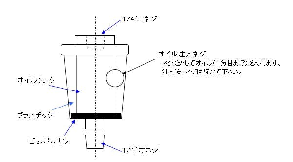 ●取付ねじ/R(PT)1/4”×Rc(PT)1/4”●重量/40g●オイル部分の容量/5ml●使用圧力/0.5~0.8MPa