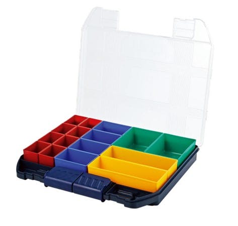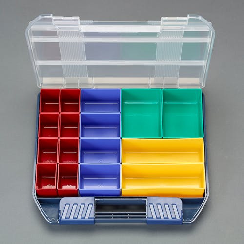 ●サイズ(mm)…424×375×72(H)●トレー…赤:8(個)青:4(個)緑:2(個)黄:2(個)●材質…本体:超高耐衝撃ABS樹脂SPBOX:高耐衝撃性コーポリマー●カラー…クリア/ブルー●重量…2kg●バックルはスーパーロック方式でロックかけ忘れによる中身の飛び出しを防ぎます●収納物が取り出しやすい底部アール加工付。小箱(SPボックス)●替トレーはEA508M-1~-4