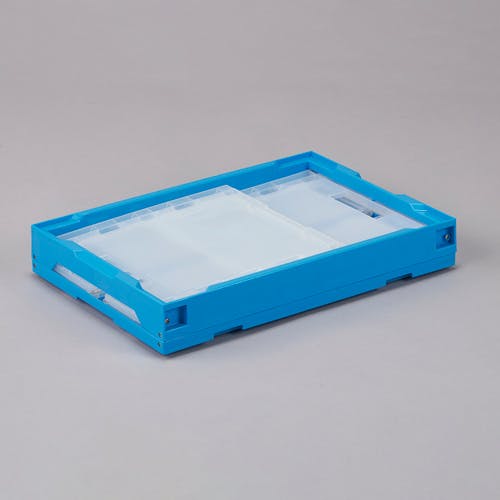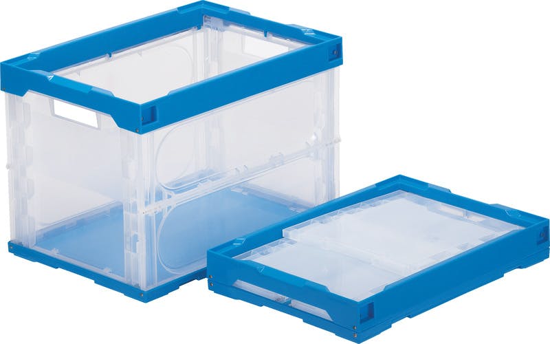 ●容量…60.7L●外寸(mm)…530×366×380●内寸(mm)…491×335×369●有効内寸…489×333×360mm●材質…ポリプロピレン●色…透明/ブルー●圧縮荷重…3.13kN(319kgf)●折りたたみ時全高…86mm●積み重ね可能●持ち手有り