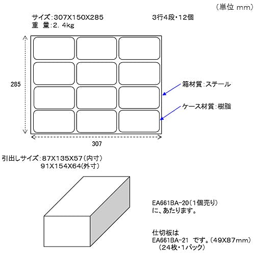 ●サイズ…307×150×285(H)mm●引き出し…外寸:91×154×64(H)mm内寸:87×135×57(H)mm●材質…外側:スチール 引き出し:樹脂●重量…2.4kg●仕切り板…6枚(付属)●別売アクセサリー…引出し(1個):EA661BA-20仕切り板(24枚):EA661BA-21●3列4段●半透明の引出しで中身の確認が可能