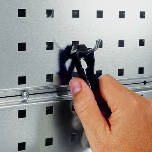●穴のあいたパネルにフックなどを掛けて、自在にカスタマイズできる工具収納ラックです(※フック・ホルダー類は別売です。関連商品をご覧ください。)●サイズ…440×520mm●壁取付ねじ穴径…5mm(6か所)●ビスは付いておりません。●材質…スチール●入数…1枚●重量…1.3kg●耐荷重…75kg(1枚あたり)