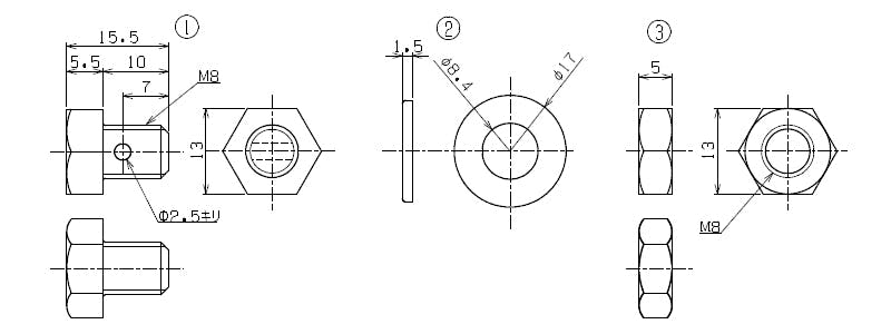 ●適合ワイヤー径…1.2mm●対辺(mm)…14.6●全長(mm)…13●材質…ステンレス(SUS304)●入数…5個●軸のボルト部分にワイヤー2本が通る穴があいています。その穴にワイヤーを通してナットを上下から閉めてください。