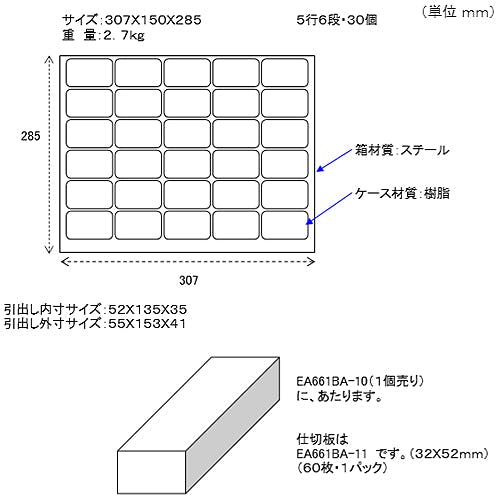 ●サイズ…307×150×285(H)mm●引き出し…外寸:55×153×41(H)mm内寸:52×135×35(H)mm●材質…外側:スチール 引き出し:樹脂●重量…2.7kg●5列6段●半透明の引出しで中身の確認が可能●仕切り板…10枚(付属)●別売アクセサリー…引出し(1個):EA661BA-10仕切り板(60枚):EA661BA-11