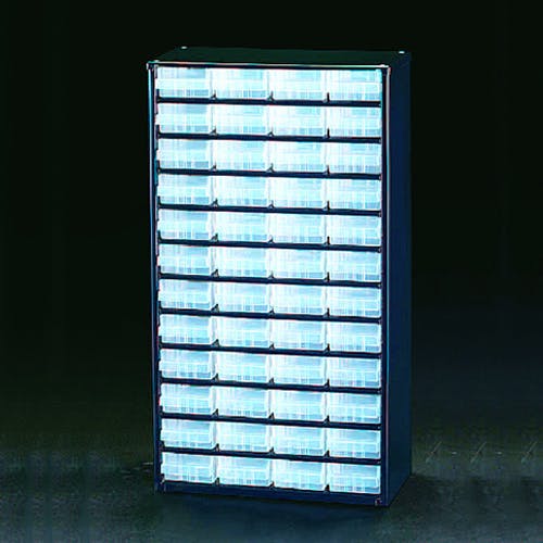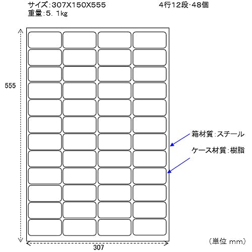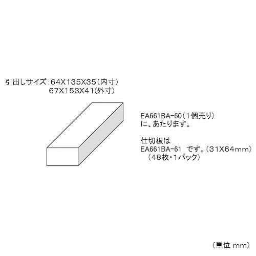 ●サイズ…307×150×555(H)mm●引き出し…外寸:67×153×41(H)mm内寸:64×135×35(H)mm●重量…5.1kg●材質…外側:スチール引き出し:樹脂●4列12段●半透明の引出しで中身の確認が可能●仕切り板…8枚(付属)●別売りアクセサリー…引出し(1個):EA661BA-60仕切り板(48枚):EA661BA-61