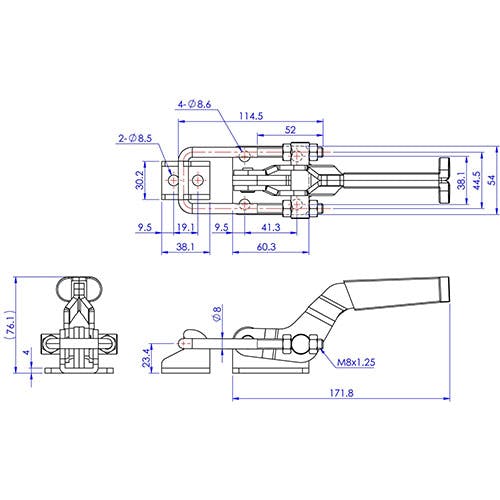 ●横ラッチ型●材質…ステンレス●締付能力…900kg●サイズ…54×171.8×76.1mm●取付金具…54×60.3mm●取付穴…φ8.6mm 4箇所、φ8.5mm 2箇所●環の全長…114.5mm●重量…680g●環の長さ調整が可能です。