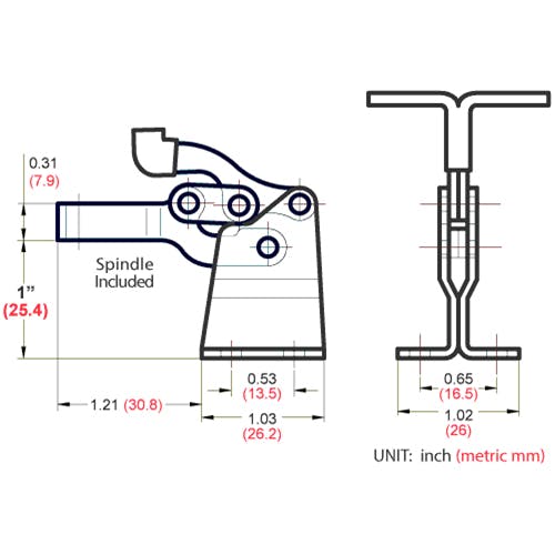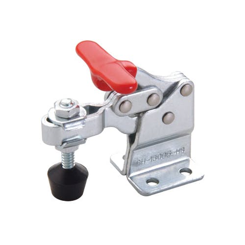 ●垂直レバー・下方押え型●ハイベースタイプ●クランプ部…ネオプレンキャップ●本体材質…スチール、亜鉛メッキ●サイズ…26(W)×57(L)×48(H)mm●取付金具サイズ…26×26.2mm●取付穴…φ4.4×4箇所●重量…86g