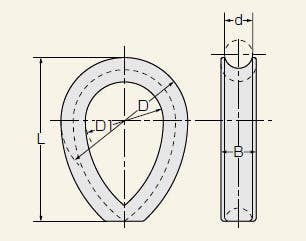 ●材質…SS400相当品●サイズ(mm)…d:10、L:58、B:13、D:45、D1:28●使用ワイヤー径…10mm●重量…60g●用途…被覆しないワイヤーロープ用●仕上…溶融亜鉛メッキ
