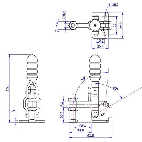 ●垂直レバー・下方押え型●締付能力…91kg●本体材質…ステンレス●サイズ…39.7(W)×65.8(L)×104(H)mm●取付金具サイズ…39.7×25.4mm●バーの開き…95°●ハンドルの開き…60°●取付穴…φ5.2mm×4箇所●重量…160g