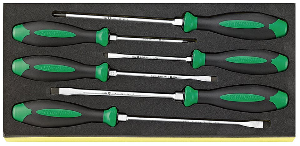 ●メーカー…STAHLWILLE(スタビレー)●型番…TCS 4622/4632●〈セット内容〉…6点●トレーサイズ…175×350×35(H)mm●(+)ドライバー…#2×100mm、#3×150mm●(-)ドライバー…1.0×100mm、1.2×125mm、1.2×150mm、1.6×175mm●重量…845g●トレイ付きのツールセット