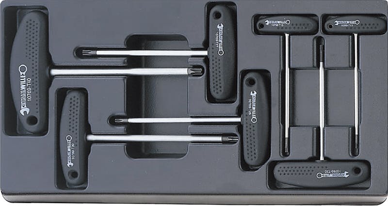 ●メーカー…STAHLWILLE(スタビレー)●型番…ES 10769/7●<セット内容7点>●トレーサイズ…175×350×35(H)mm●サイズ…T10・T15・T20・T25・T27・T30・T40●軸長…100~130mm●重量…450g●トレイ付きのツールセット