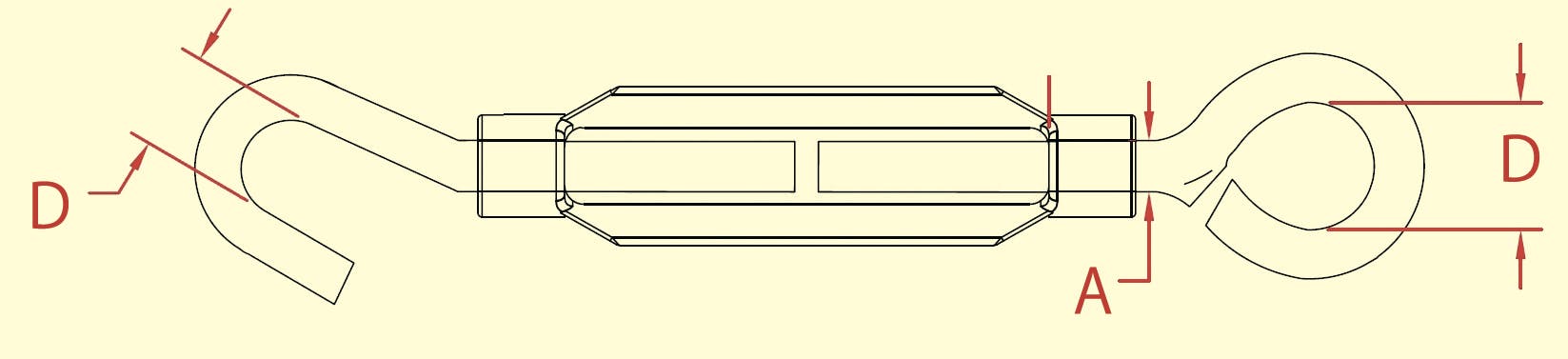 ●サイズ…フック:(A)9.5mm、(D)15.2mmアイ:(A)9.5mm、(D)16mm●最小値(mm)…187.1●使用荷重(kg)…81●材質…本体:アルミニウムボルト:SUS304