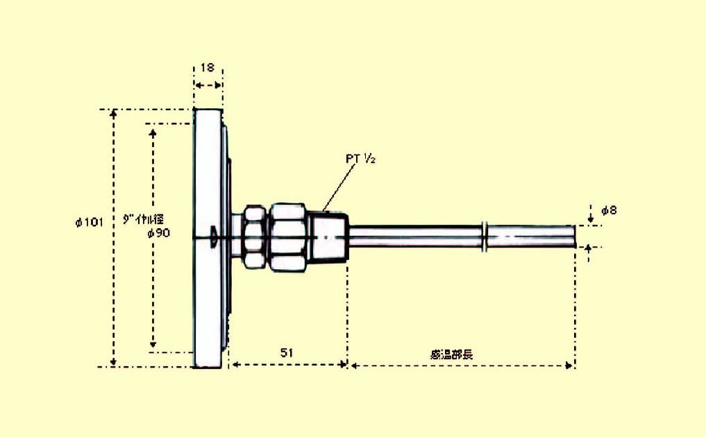 ●メーカー…佐藤計量器製作所●型番…BM-T-90S●オールステンレス●ケース外径…101mm●取付ネジ…PT1/2"●感温部径…8mm●ダイヤル径…90mm●室内用●測定範囲(℃)…0~150●感温部長(mm)…150●1目盛…2℃●総重量…約380g