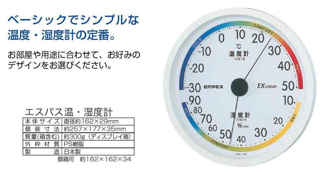 ●メーカー…エンペックス気象計(EMPEX)●型番…TM-2331●サイズ…φ162×29mm●材質…枠:プラスチック樹脂、風防:ガラス●精度…±1℃(-20℃~+40℃)、±2℃(左記以外)●重量…300g●測定範囲… 温度:-30~+50℃ 湿度:10~90%