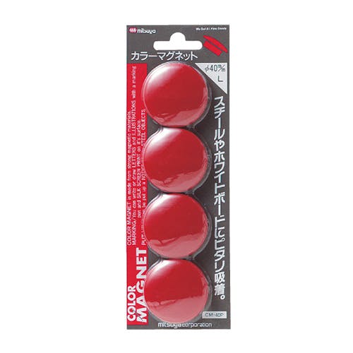 ●サイズ…φ40mm●カラー…レッド●重量(g)…再生PS樹脂40%,マグネット●入数…4個●ちょっとしたメモ留めや掲示に便利です。●磁着面に傷防止フィルム貼合。